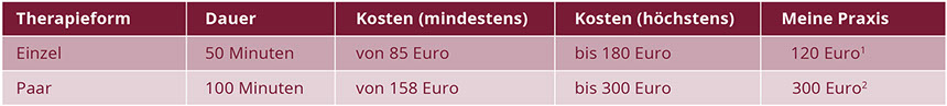 Der Preis für Paartherapien ist als Gesamthonorar (für beide Personen) zu verstehen.